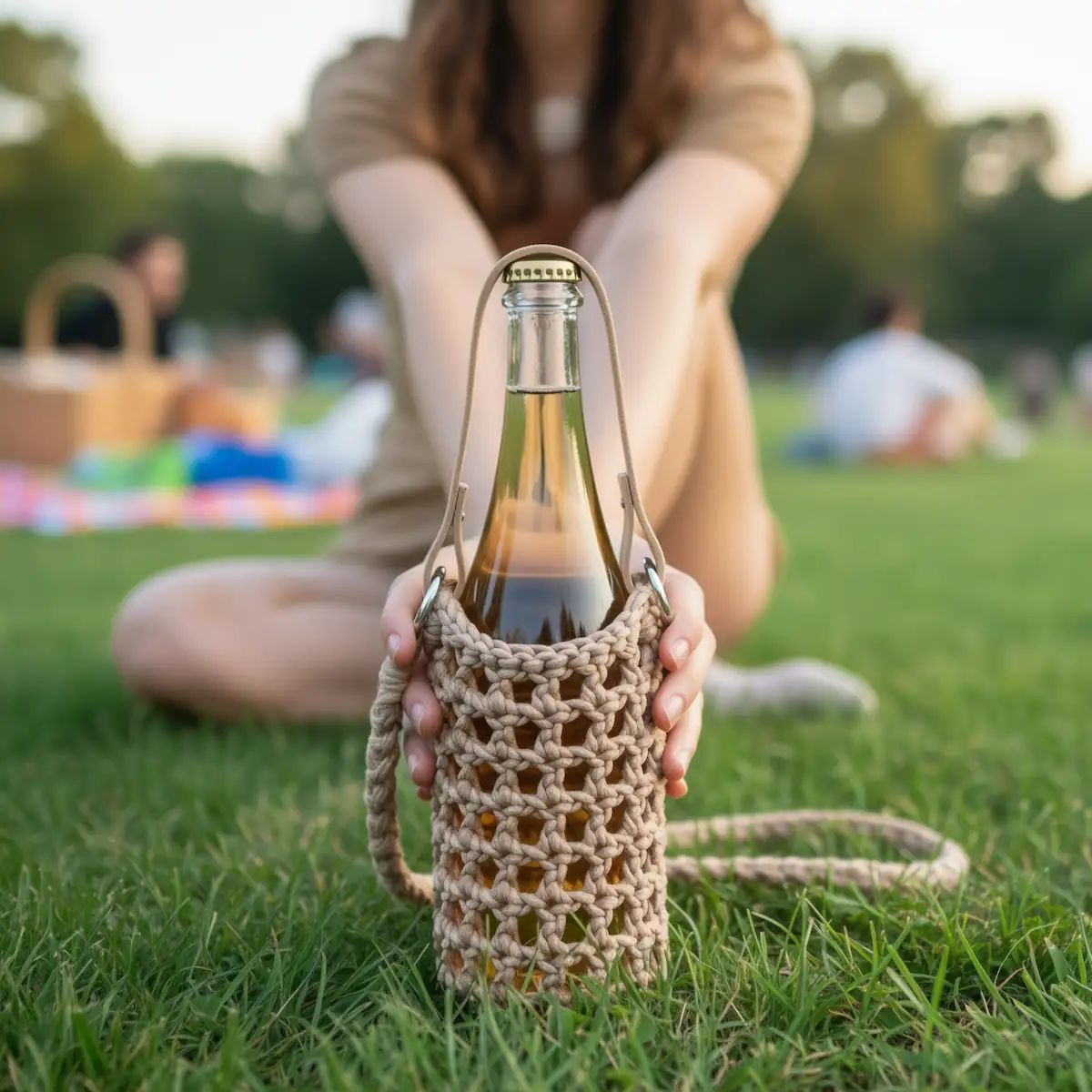 S háčkem o velikosti 6 mm vytvoříš nosič o výšce přibližně 14–17 cm a průměru cca 8 cm. Poutko má délku 78–85 cm – můžeš ho nosit krátce s přiloženým koženým poutkem z pravé kůže (30 cm) nebo si připnout delší uháčkované poutko pomocí dvou karabin a mít ruce volné. Perfektní na vinobraní nebo piknik! 🍇
